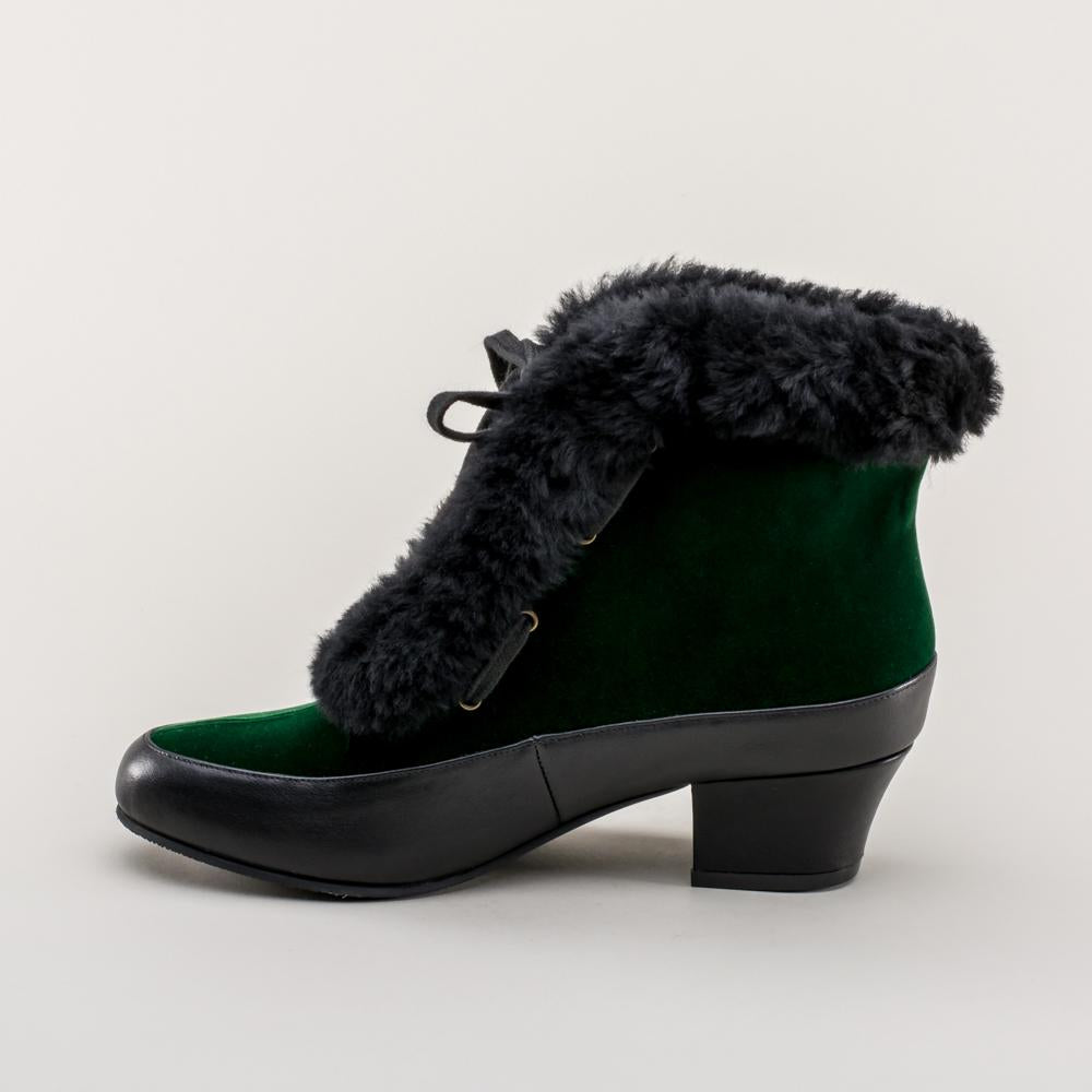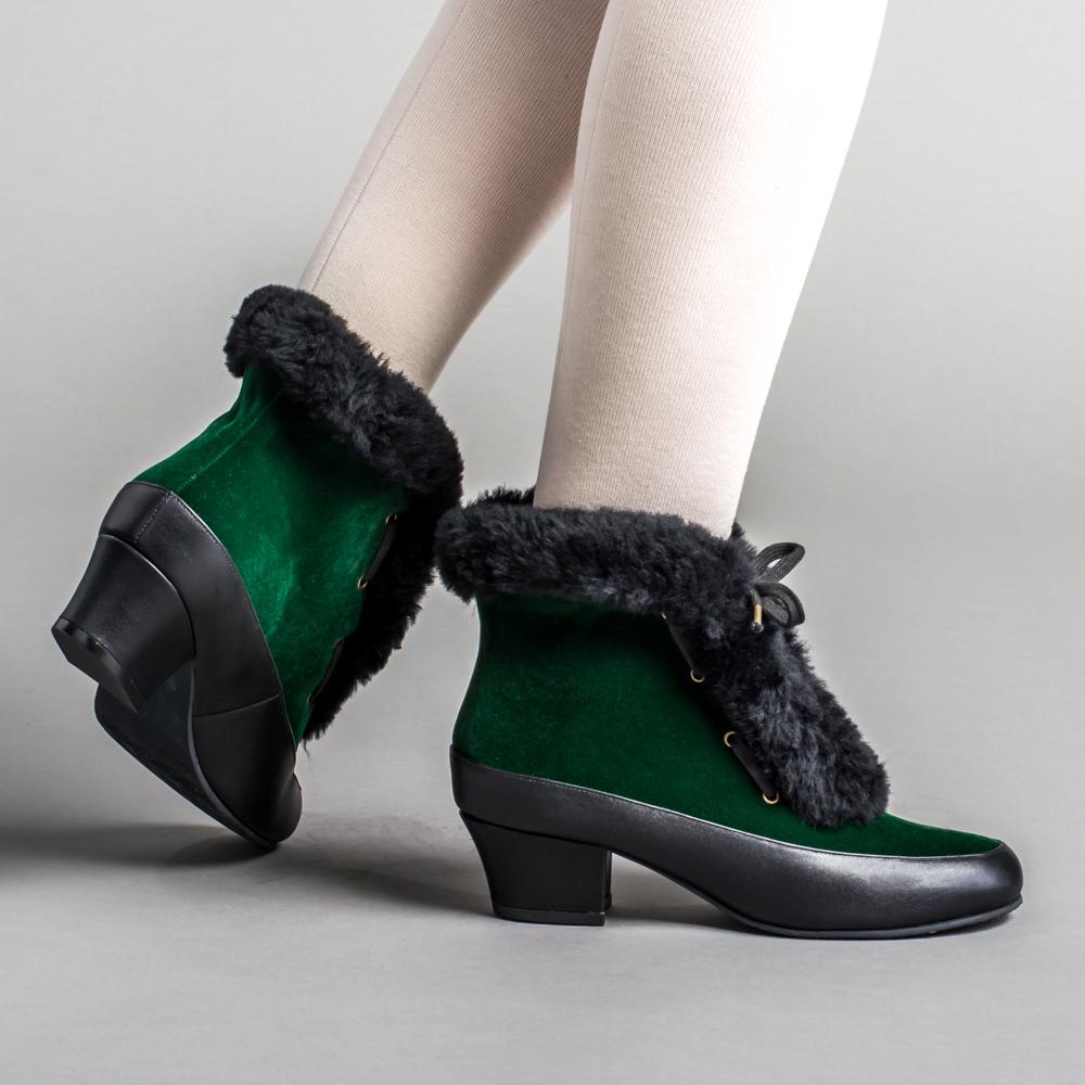 Alpen Retro Winter Booties are just the fashionable footwear you need for your winter vintage outfits. These booties are based on original Montgomery Ward overshoes, also known as galoshes, but are made as regular boots. We've stayed faithful to the velveteen upper and houndstooth lining, opting to use ethically sourced sheepskin trim and leather foxing and heel. These beautiful boots are cozy and practical for winter wear, with rubber soling.
