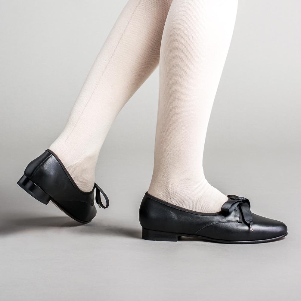 These slip-on shoes are accurate for c. 1790 - 1820. They feature an all leather upper with bound edges and a grosgrain ribbon tie on the vamp. The lining and soling are both leather, with the edges of the sole and stacked leather heel blacked. These beautiful shoes have a rounded toe and can be worn with daywear for women, perfect for Jane Austen, Napoleonic Era, War of 1812, and other Regency events.