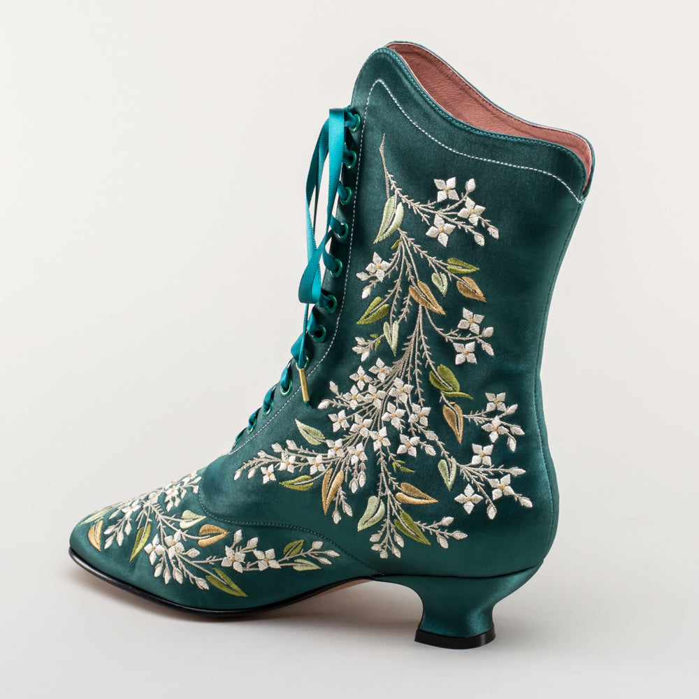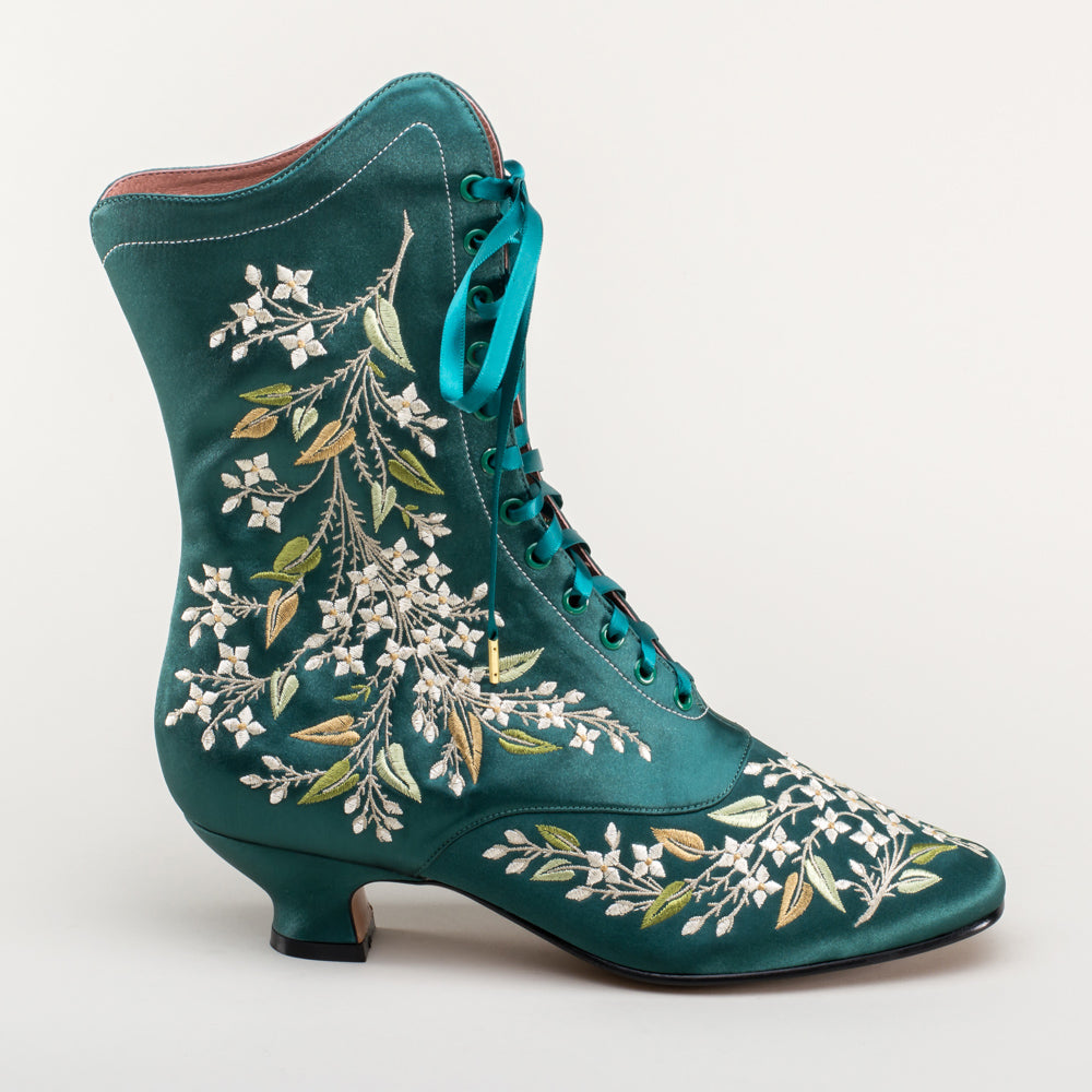 Indulge in a piece of history with Flora Embroidered Boots, an exclusive reproduction of the intricate opera and evening boots popular in the late Victorian period. Expertly crafted with intricate botanical detailing, these stunning satin boots will take you back to an era of sophistication and finesse. Wear them with bustle and Belle Epoque attire from the 1870s to c. 1900, or with modern dress as a statement piece.