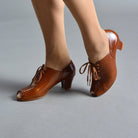 Jenny sports a decorative keyhole opening over the vamp, and a small peep-toe peeking through overlapping leather detailing over the toe. The perforated smooth leather vamp allows for breathability through all seasons. Stable, leather-wrapped 2.5”/5.7 cm Cuban heels will keep feet comfortable for hours of wear. Matching laces lace through hidden eyelets, complimenting the eye-catching colors of the leather.