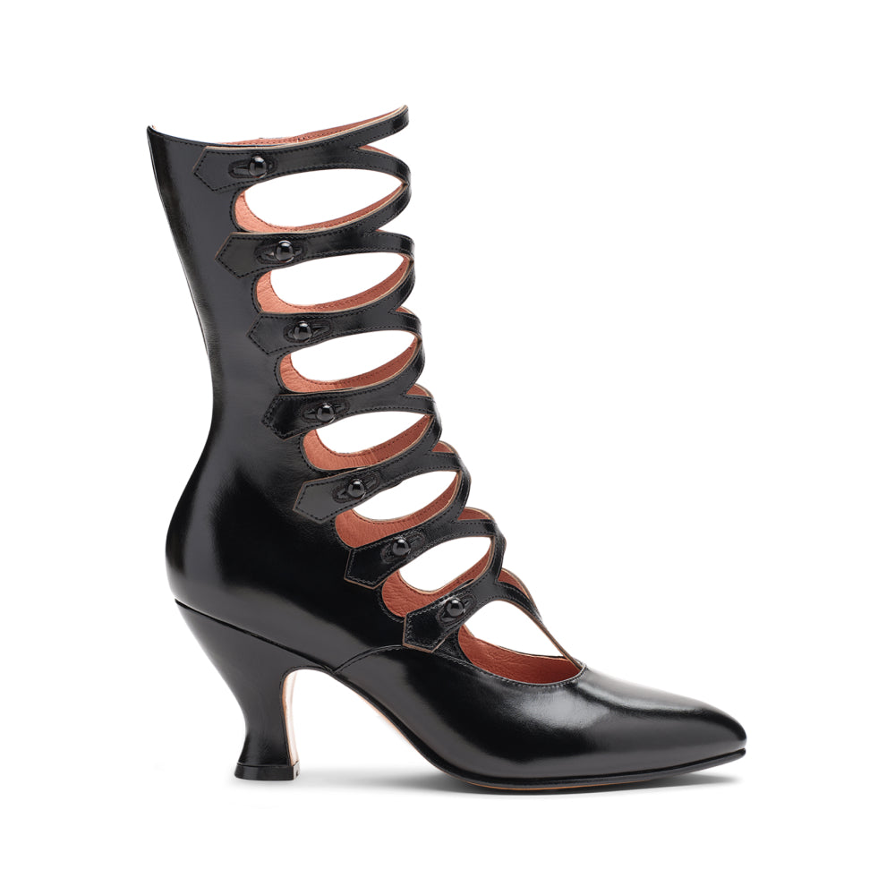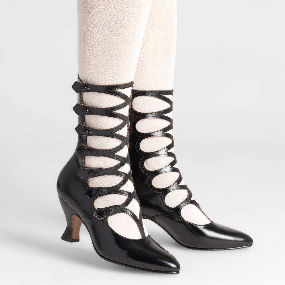Cleo is the showstopping, sophisticated, and irresistibly seductive Edwardian boot that you have been dreaming of! Exquisitely detailed cutout straps wrap around the leg, with finely shaped strap closures. Cleo features functional button closures, with elastic-mounted half-dome buttons. Cleo's period-accurate, beautifully curved boot shaft caresses the calf and creates that gorgeous historical shape we all crave. Designed on our beloved Edith Edwardian last, Cleo perfectly evokes the aesthetic of late 19th century/early 20th century evening glamour. Cleo features our custom, curvaceous, 3"/7.62 cm French spool heel, and is available in both standard and wide width. Pair Cleo with your favorite Victorian and Edwardian costumes, or wear them with your contemporary skirts and dresses to add elegance to any ensemble.
