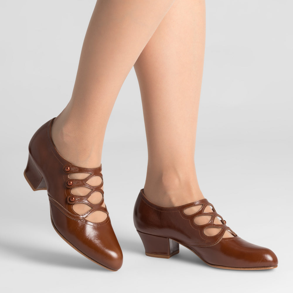 Gloria seamlessly combines all of the elegance of 1910s/1920s footwear with practicality, resulting in a refined shoe fit for all-day wear. Finely detailed leather straps with period-authentic cutouts glide gracefully over the vamp and close with functional matching buttons. Gloria's comfortable almond toe and stable, 1.6"/4 cm Cuban heel make this shoe suited for promenades on the boat deck and dancing the night away. This wonderfully versatile shoe is accurate to the 1910s all the way through to the 1940s. Gloria is available in both standard and wide width.