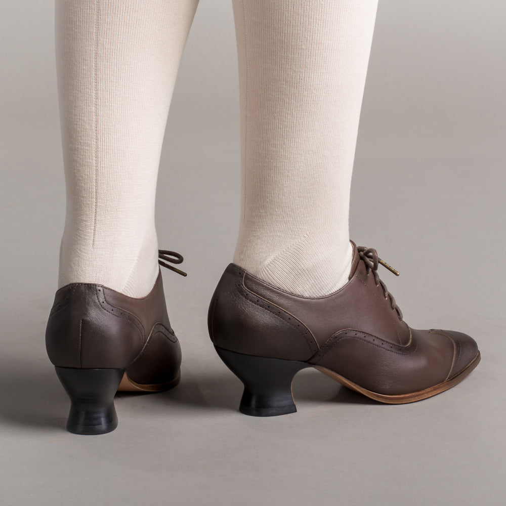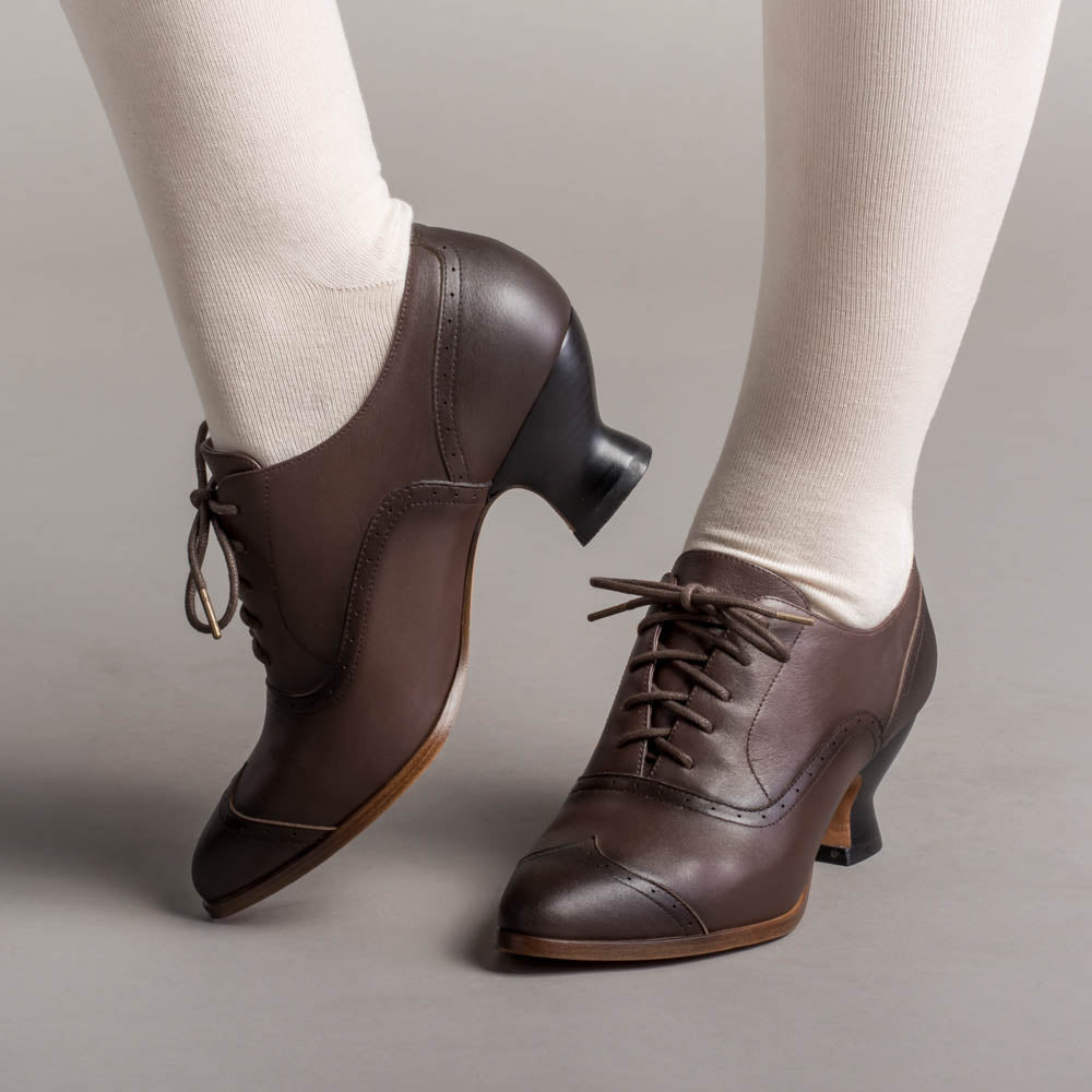 Whether you are fighting for the right to vote or exercising that right today, the Londoner Edwardian Oxfords will keep you on your feet, on the go, comfortably, and chic all day long. Made of real leather with leather lining and soles, these beautiful reproduction Edwardian oxford shoes feature an adjustable lace-up closure, eyecatching broguing on the uppers, and a stacked-look French heel. Paired with walking skirts of the 1910s or wide-legged trousers of the 2020s, the timeless Londoner oxfords are an excellent choice.