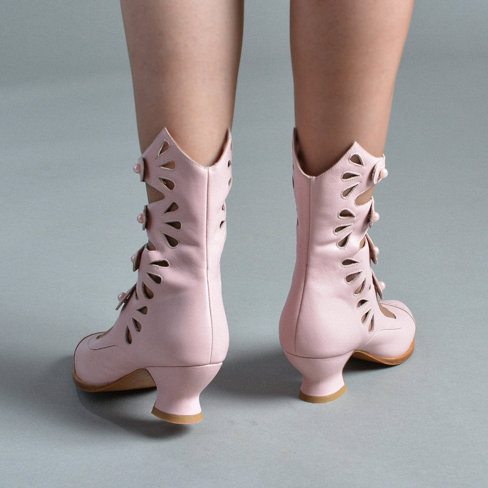 With a shaped top and scalloped sides, paired with a practical Louis heel, the Colette are the boots dreams are made of. Pair them with late Victorian, Edwardian, and Great War impressions, as well as cosplay, Downton Abbey, Titanic, Steampunk, Lolita, and Gothic attire. Colette boots may be custom fit to your ankle and calf by moving the buttons.