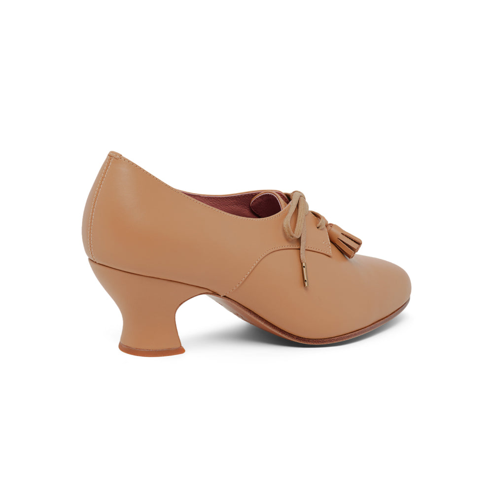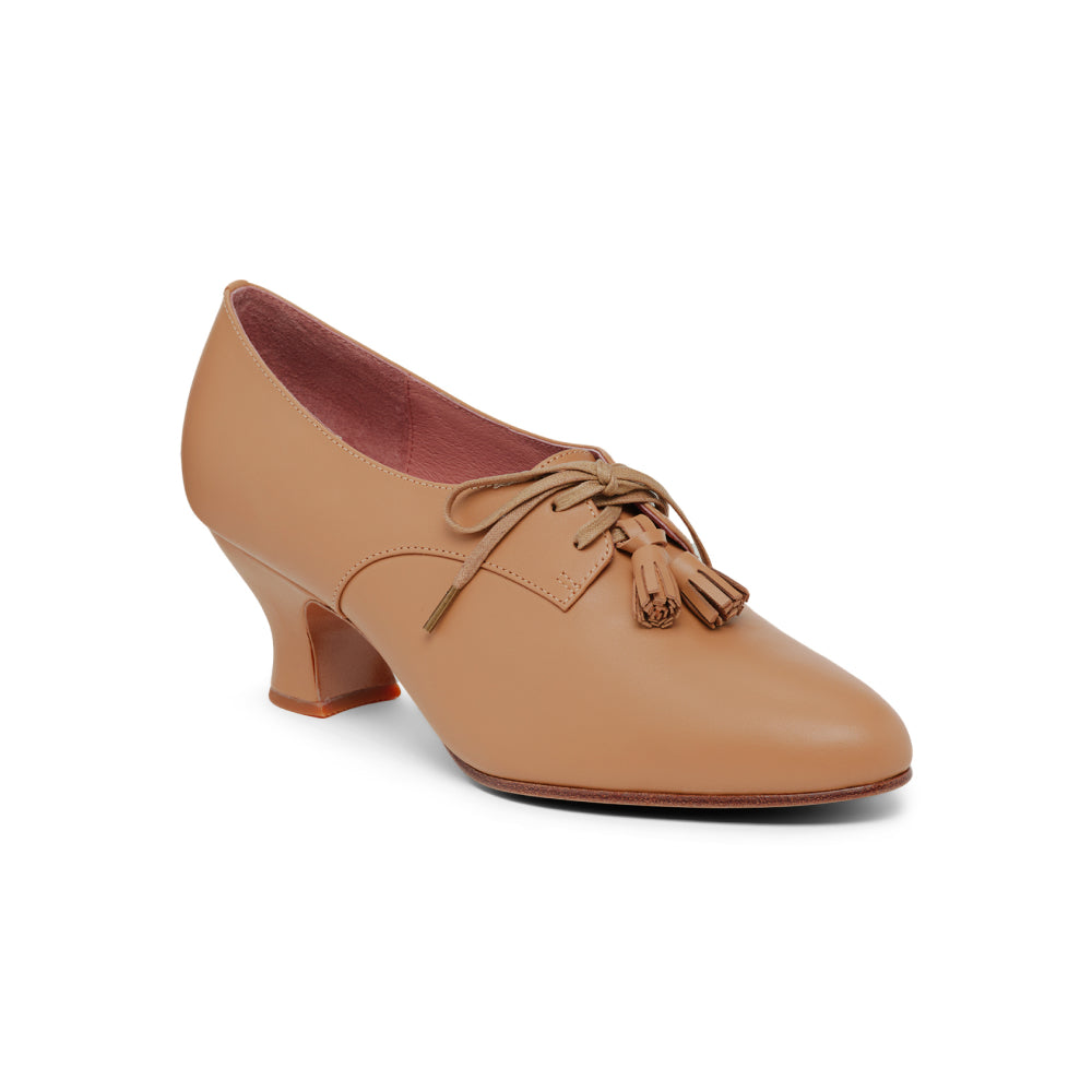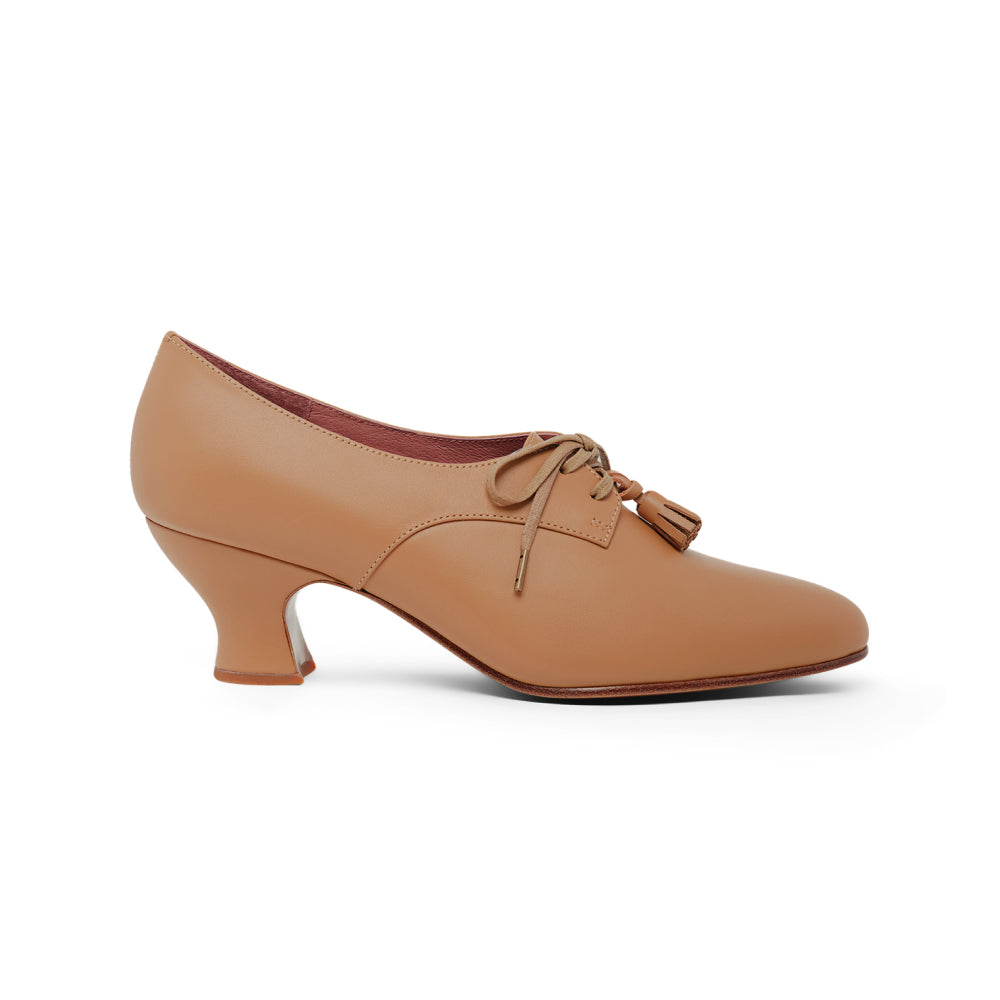 Cordelia is the versatile and attractive Edwardian Oxford everyone needs in their wardrobe. These beautifully crafted shoes are carefully reproduced from period originals, and feature a historical silhouette, lace-up closures, and removable decorative tassels. Cordelia is built on our custom, perfectly balanced, 2"/5.08 cm French spool heel, so you can walk comfortably in style. Available in a selection of neutral-colored leathers, Cordelia blends seamlessly into the leg line for a sleek and sophisticated look that goes with any ensemble. Cordelia comes in both standard and wide widths.