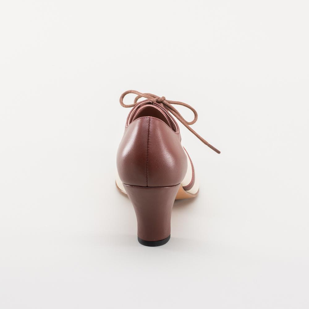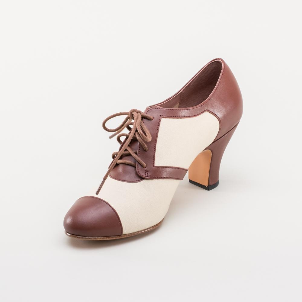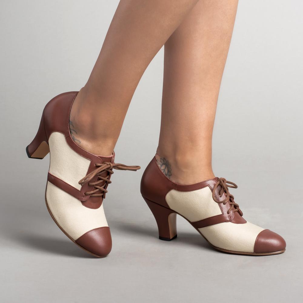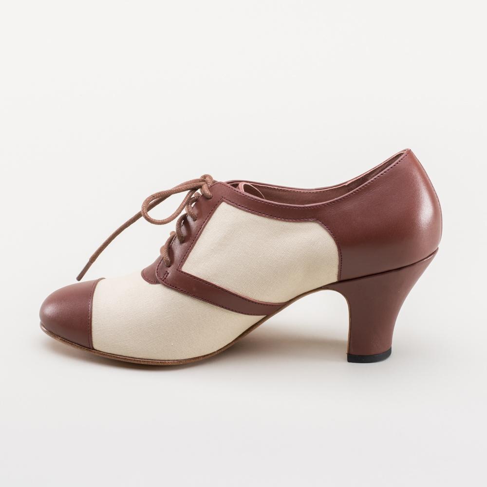 How better to complete a 1920s or 1930s sporty ensemble than with a perfect pair of Evelyn oxfords? These retro spectator oxfords are made of tan canvas combined with a rich brown leather on a 2 3/8" / 6 cm Spanish heel and insole arch support.