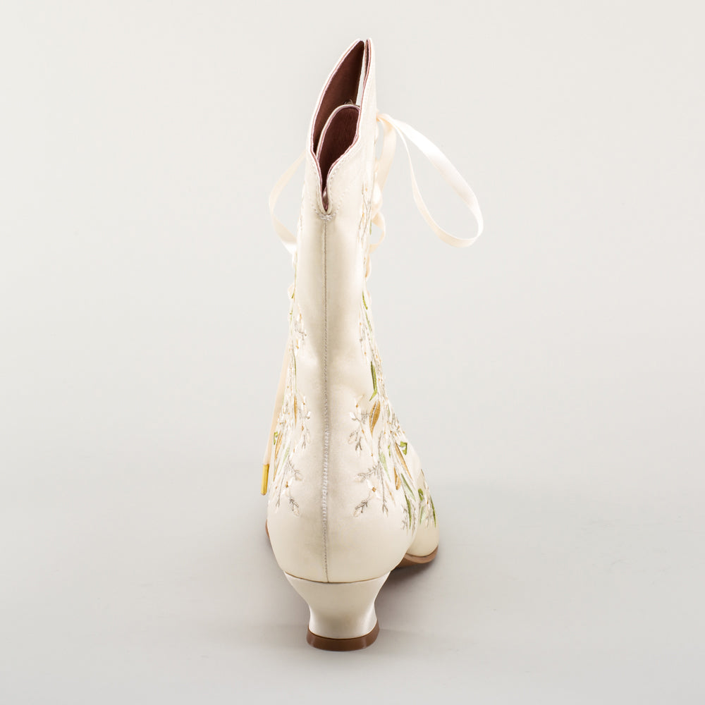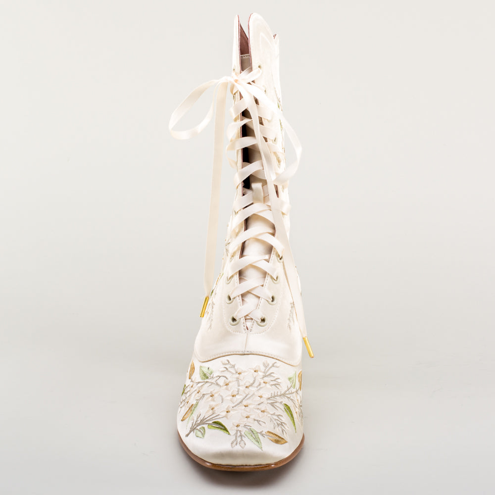 Indulge in a piece of history with Flora Embroidered Boots, an exclusive reproduction of the intricate opera and evening boots popular in the late Victorian period. Expertly crafted with intricate botanical detailing, these stunning satin boots will take you back to an era of sophistication and finesse. Wear them with bustle and Belle Epoque attire from the 1870s to c. 1900, or with modern dress as a statement piece.