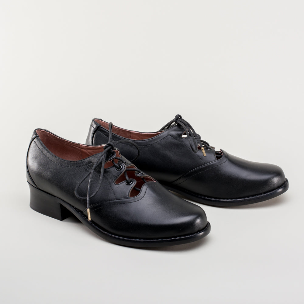 Made in all leather with leather soles, the Ghillies come with two sets of laces for different looks. A sculptural, round toe is paired with our stable 1.25 inch / 3.2 cm heel. These are an all-day every-day shoe offering an elevated and unique look perfect for the 1930s through the 1960s.