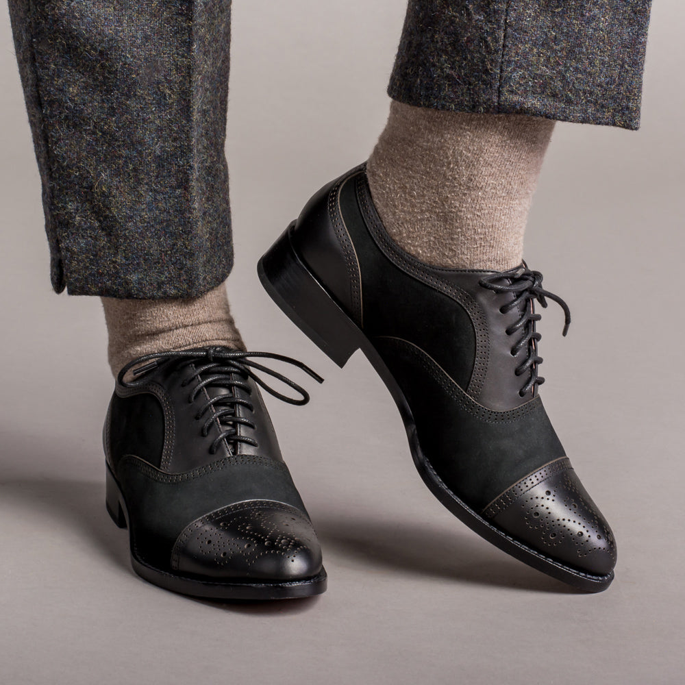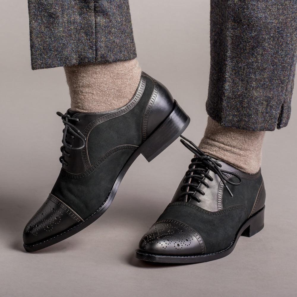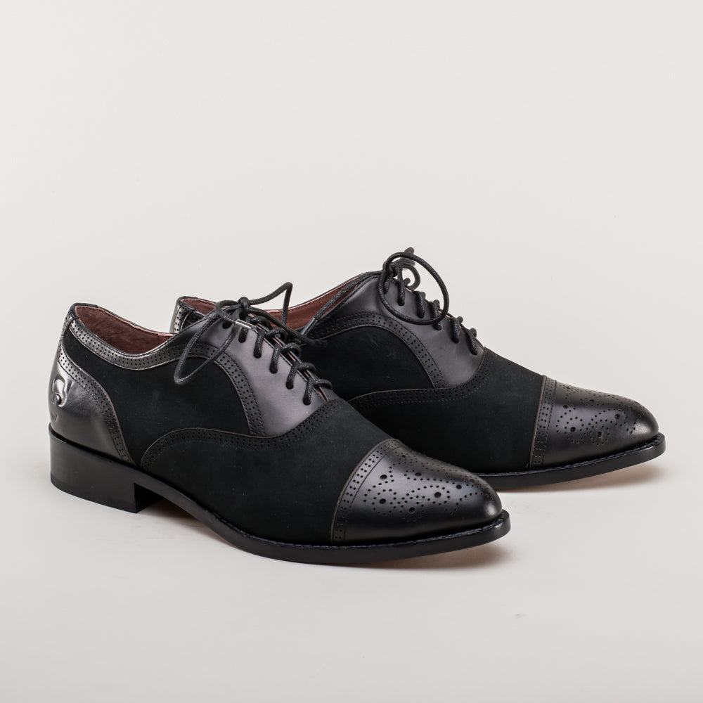From the creative closet of Dandy Wellington come these gorgeous vintage cap toe oxfords made in rich and sophisticated nubuck and smooth leather. The Gladys oxfords feature fine brogue detailing including a clever "W" design on the cap toe along with the signature Dandy Wellington logo stamp on the heels.