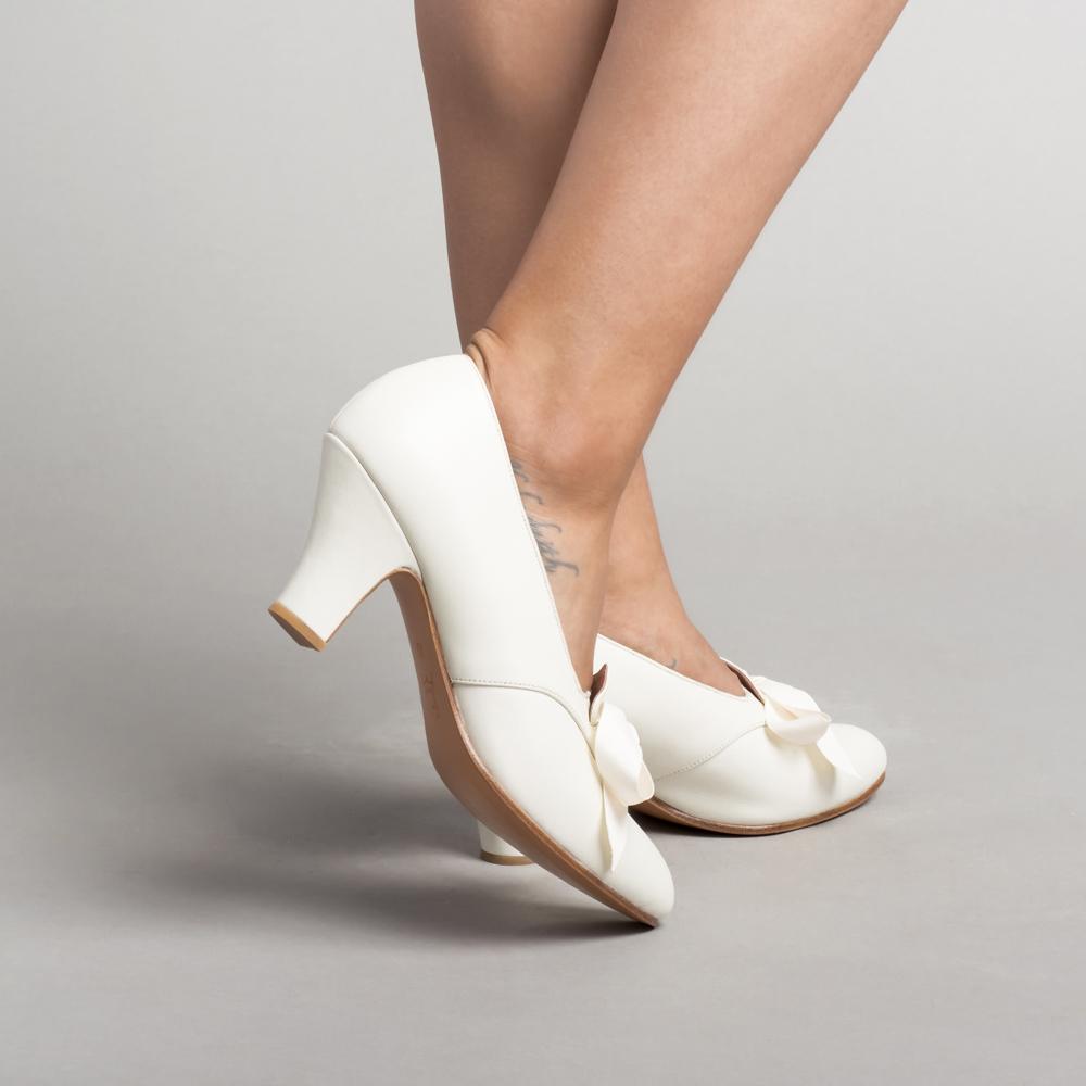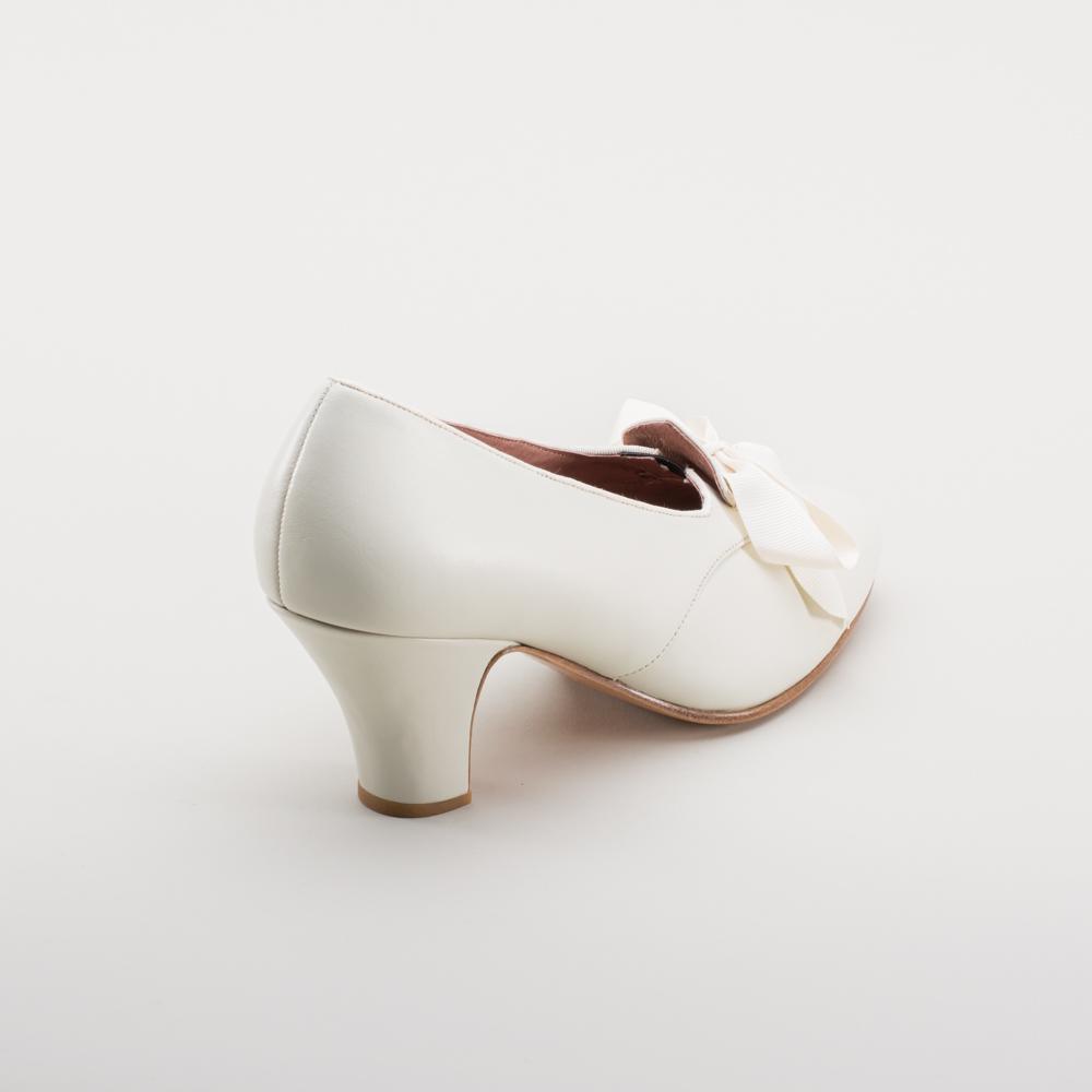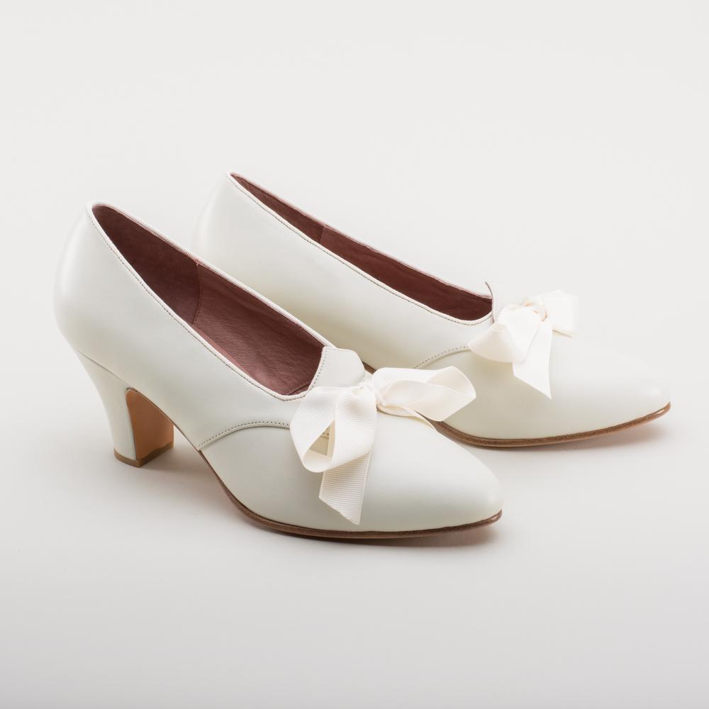 Glamour and practicality pair perfectly with the beautiful Hazel slip-on pumps. Glossy leather, an almond-shaped toe, 2.5 in / 6.35 cm repro heel, and the cutest little ribbon bow tie make these beautiful shoes perfect for the 1920s all the way through to 1950.