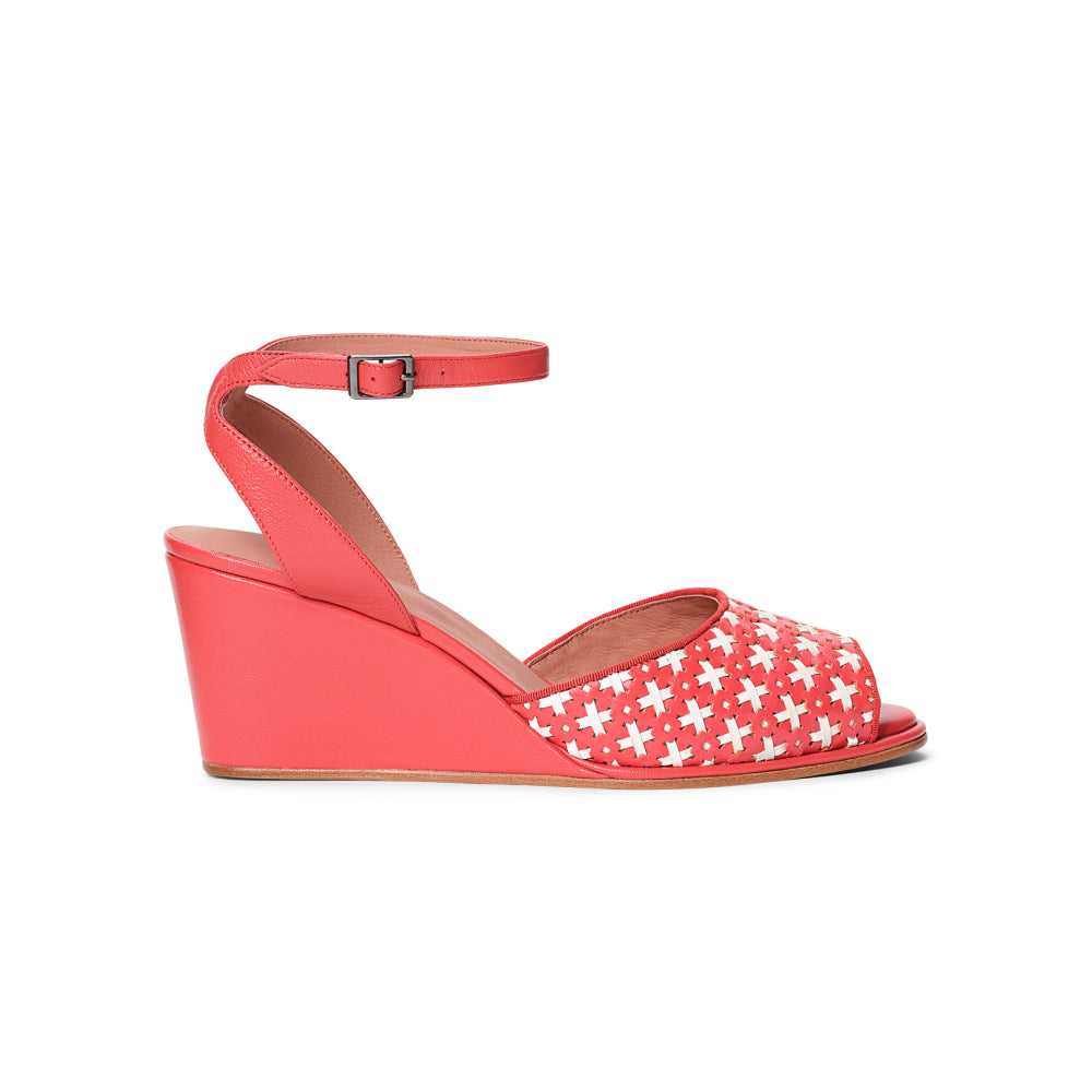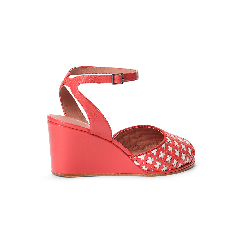 Judy brings a warm summer breeze to life with bold colors, rich textures, and a classic vintage silhouette. This gorgeous sandal features our custom vintage-reproduction 2.75"/ 6.9 cm wedge heel, which is carefully sculpted and balanced for all-day comfort. Judy's vamp is crafted from stunning interwoven two-tone smooth leather, paired with a matching smooth leather heel and straps. Accurate to the 1930s-1950s, these splendid sandals are the perfect vintage touch for any warm-weather outfit.