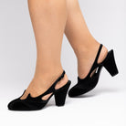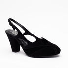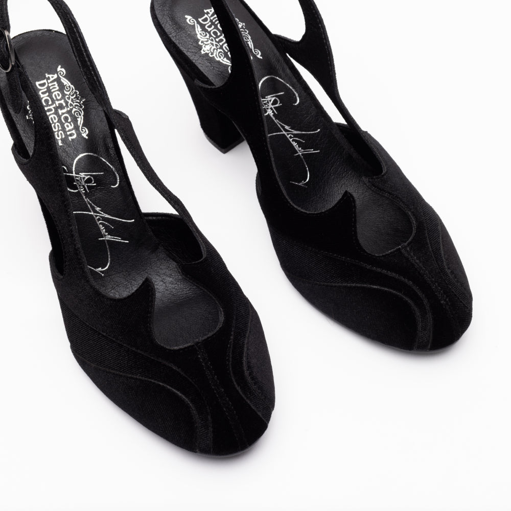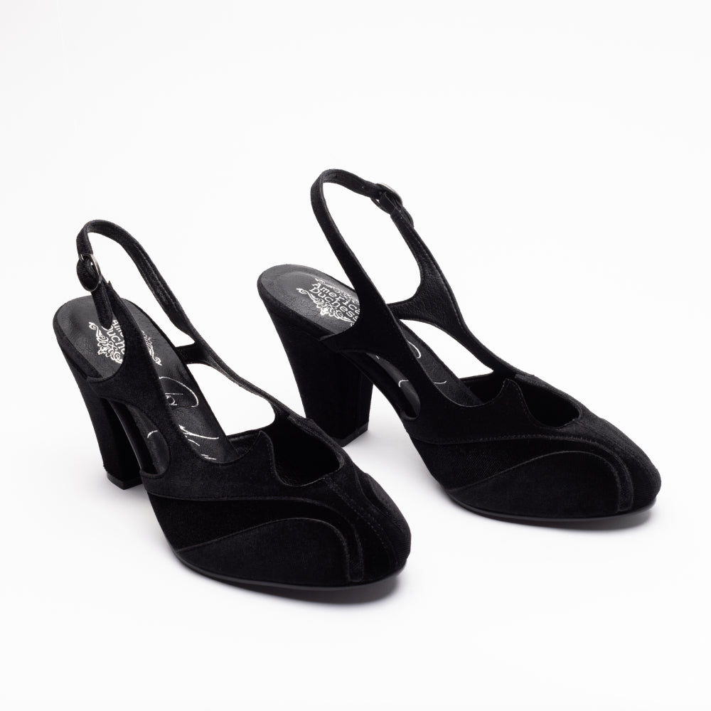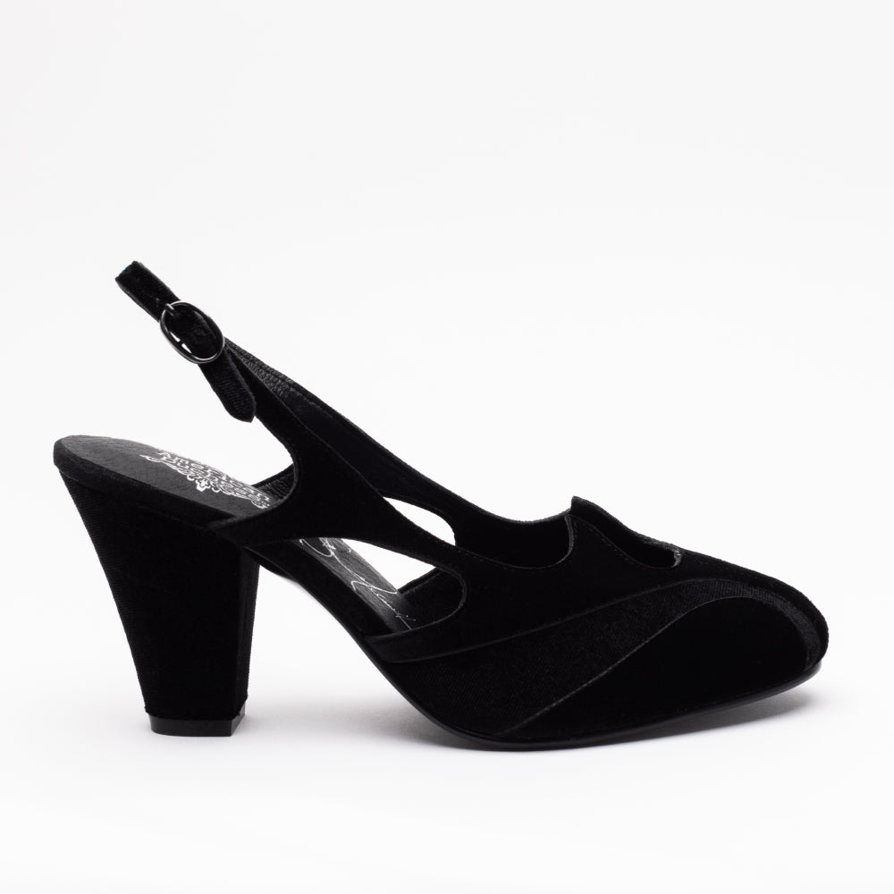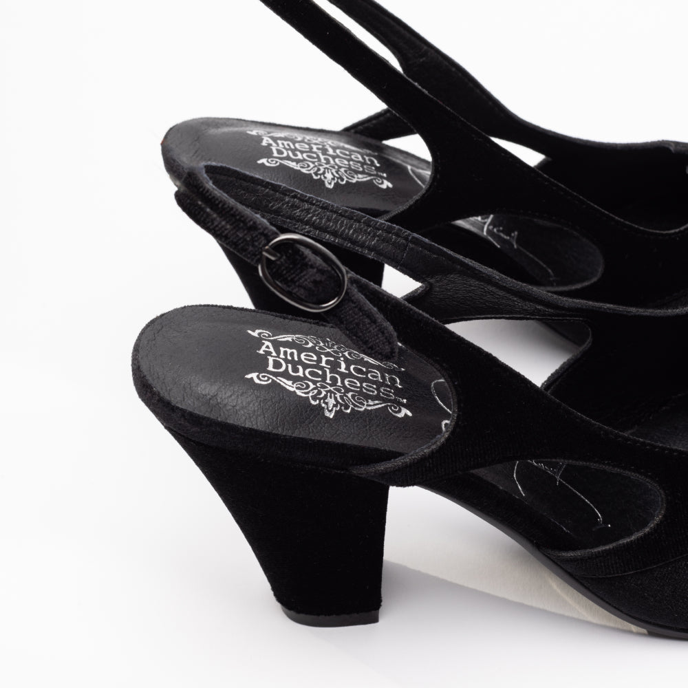 From our collaboration collection with Christine McConnell, meet the Kathryn Slingbacks! These splendid shoes are inspired by the seductive slingbacks that helped define 1940s footwear. Smooth, plush velvet uppers with decorative swooping inset motifs make the Kathryn Slingbacks utterly irresistible. Kathryn Slingbacks feature our classic, perfectly balanced 3"/ 7.62 Cuban heel. These slingbacks are leather-free, and come in 4 gorgeous colorways.