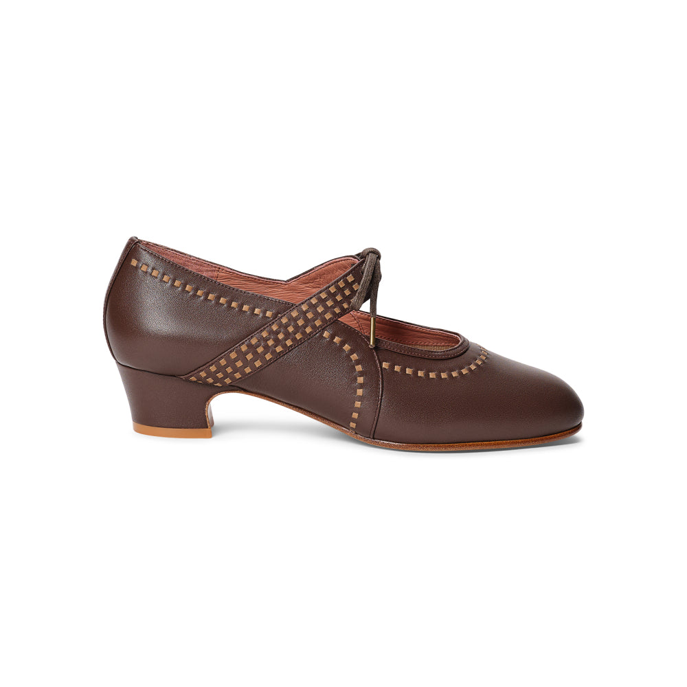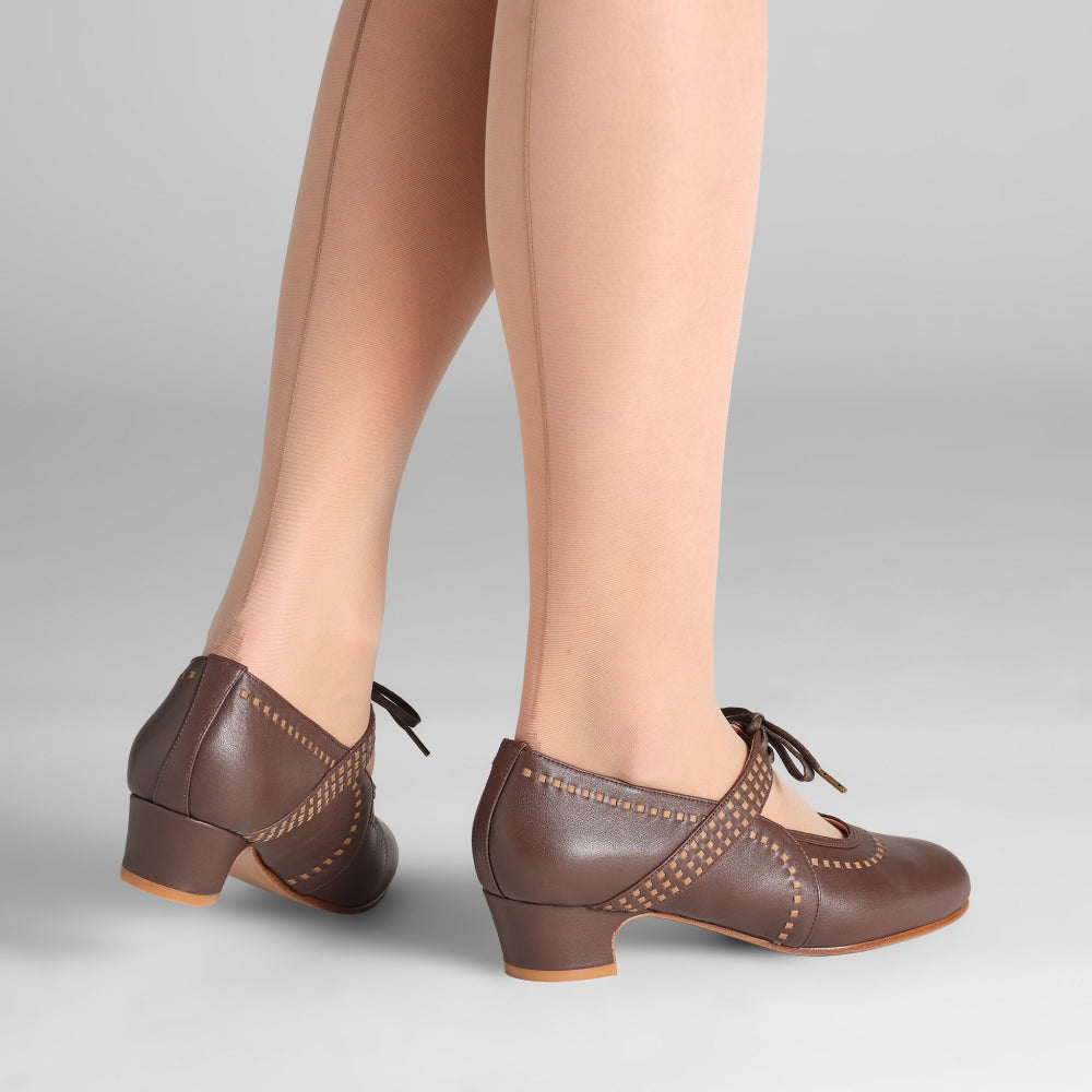 Meet Margaret, a do-it-all 1920s shoe with a unique twist. These round-toed, low-heeled beauties are built on a custom 1920s last, with a perfectly balanced 1.4"/3.6 cm heel. Margaret is decorated with intricate interwoven strips of smooth leather, which are complemented by the lace-up closure on the straps over the instep. Practical for daywear, but elegant enough for evening, Margaret is sure to turn heads wherever you go. Margaret is available in both standard and wide widths.