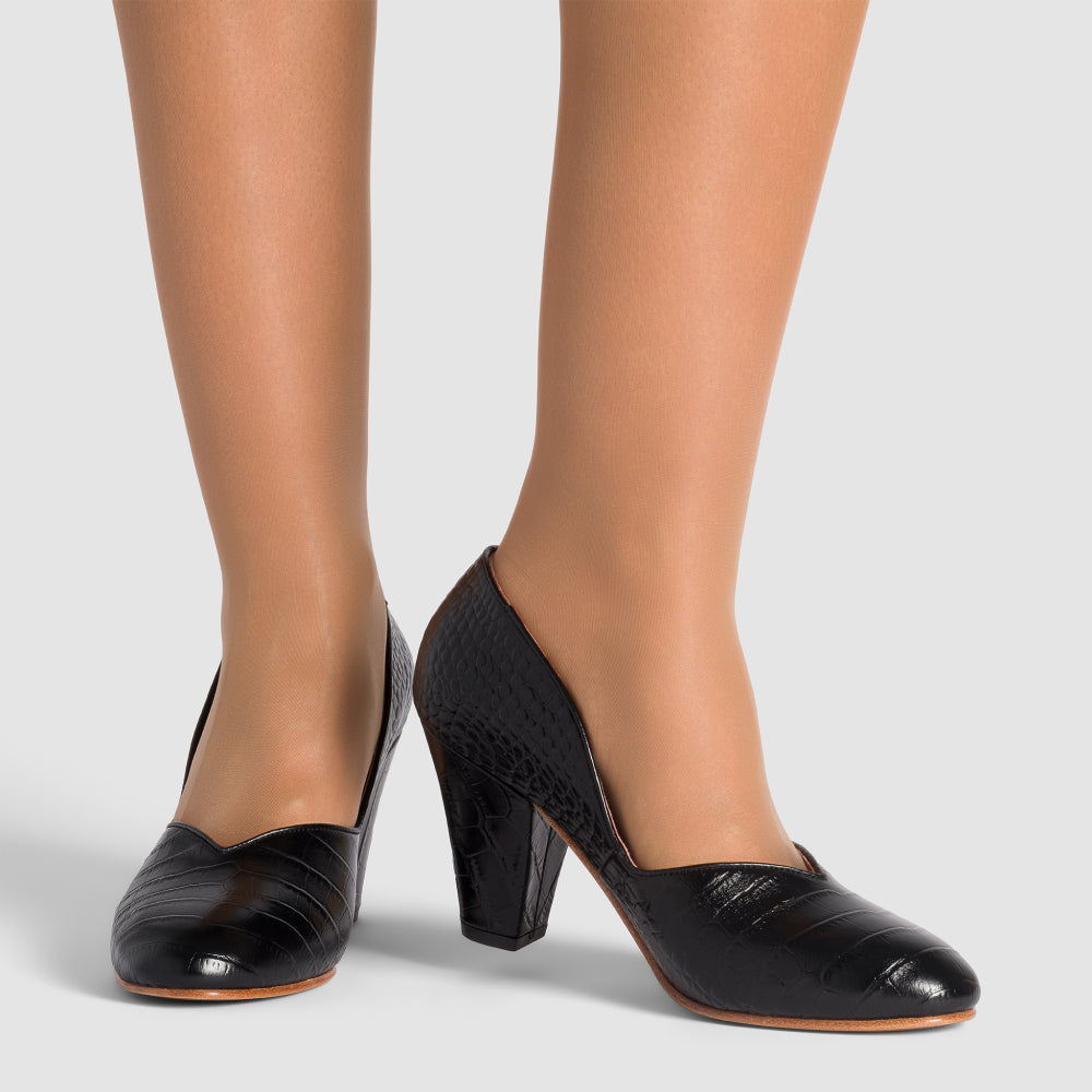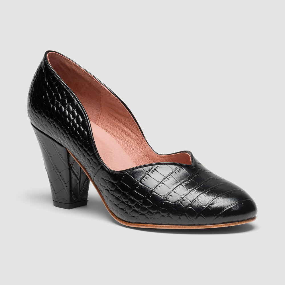 Step into a pair of our famous Marilyn 1940s Pumps, the quintessential vintage slip-on shoe for the late 1930s, 1940s, and early 1950s. Custom embossed leather uppers emulate the elevated, elegant, and in vogue mock croc pumps of the time. These beautiful reproduction shoes feature a curvaceous sweetheart vamp and rounded toes. Our custom 3"/ 7.72 cm reproduction '40s Cuban heel is stable and perfectly balanced for long-wearing comfort. Named for Marilyn Monroe, Marilyn pairs perfectly with just about every outfit for both day and evening.