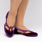 Step into a vintage-inspired fantasy with the Mildred Flats, from our collaboration collection with artist Christine McConnell! Inspired by 1950s 'flatties', these flats are unlike any you've seen before. Uppers in rich, luxe velvet, open sides, and strappy details festooned with geometric motifs make Mildred unique. Mildred features our dependable 0.5"/ 1.27 cm common sense heel, which is low and sturdy for all-day comfort. These shoes are festive, leather-free, and come in five gorgeous colorways.